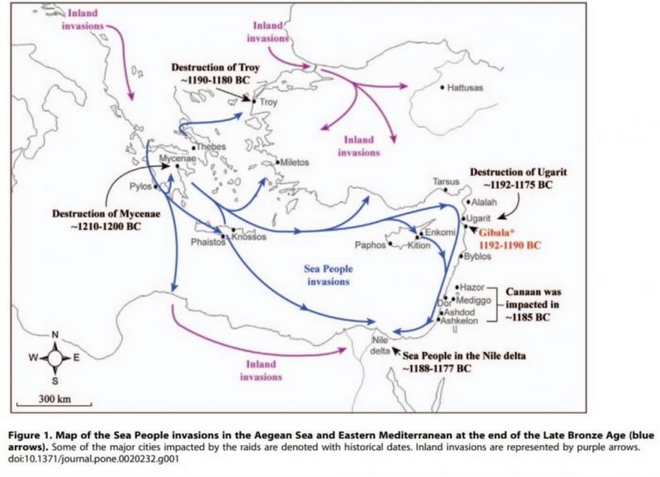 Ήταν οι «Λαοί της Θάλασσας» που σάρωσαν τα παράλια της Ελλάδας, της Μικράς Ασίας, της Μέσης Ανατολής και της Βόρειας Αφρικής, από το 1190 ως το 1050 π.Χ. Ο Drake μας αναφέρει ότι οι λόγω αυτής της κλιματικής αλλαγής και των στερήσεων οι λαοί οδηγήθηκαν σε εξεγέρσεις και σε αναζήτηση νέων πλουτοπαραγωγικών περιοχών. Στην εργασία του, ο Drake μάς δίνει μια ιδιαίτερα εύγλωττη αντιστοίχιση του κλίματος με τις ιστορικές εξελίξεις της περιόδου 2200 – 1 π.Χ. Μας τονίζει ότι η εμφάνιση των ελληνόφωνων φύλων στην Ελλάδα συνδυάζεται με συνεχή αύξηση των βροχοπτώσεων (ο κατακλυσμός του Δευκαλίωνα), ότι η πολιορκία της Τροίας μάλλον ήταν απόρροια αναζήτησης νέων περιοχών εκμετάλλευσης έπειτα από αιώνες συνεχούς ξηρασίας και ότι ο «αρχαίος μεσαίωνας» (1100 – 800 π.Χ.) συνέπεσε με δραματικά απότομη κλιματική αλλαγή.