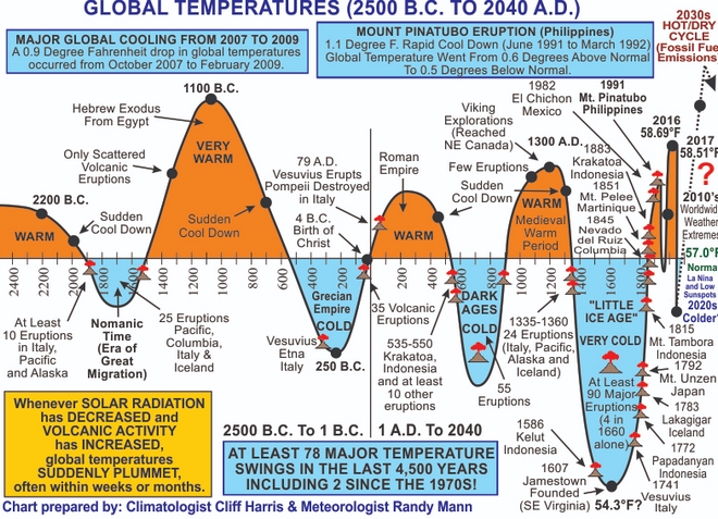 Έτσι μπορούμε να παρατηρήσουμε ότι έγιναν 10 μεγάλες εκρήξεις παγκοσμίως στην εποχή που εξερράγη το ηφαίστειο της Θήρας (16ος αιώνας π.Χ.), 35 λίγο πριν από τη γέννηση του Χριστού, 11 τον 5ο αιώνα μ.Χ. (που ακολουθήθηκαν από το ψύχος του Μεσαίωνα), 25 μεταξύ 1335 και 1360 μ.Χ. (με απόρροια τη «μίνι εποχή παγετώνων»-Little Ice Age μεταξύ 1300 και 1850 π.Χ.) και 90 μεγάλες εκρήξεις στο μεσοδιάστημα αυτό.