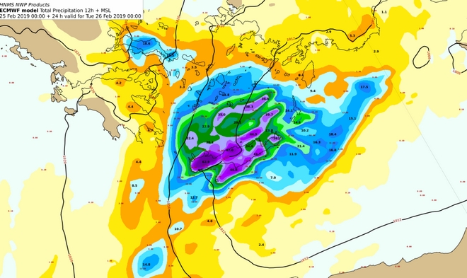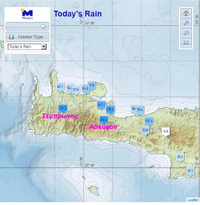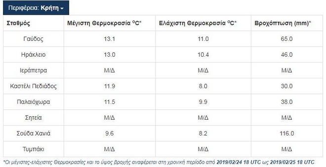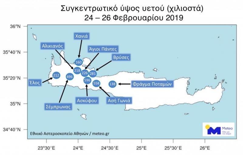 Πολύ μεγάλα ύψη βροχής σημειώθηκαν τη Δευτέρα 25 Φεβρουαρίου 2019 στην περιοχή της Κρήτης και ειδικότερα στον μετεωρολογικό σταθμό της ΕΜΥ στα Χανιά έπεσαν 116 mm εκ των οποίων τα 52 mm σε λίγες μόνο ώρες.