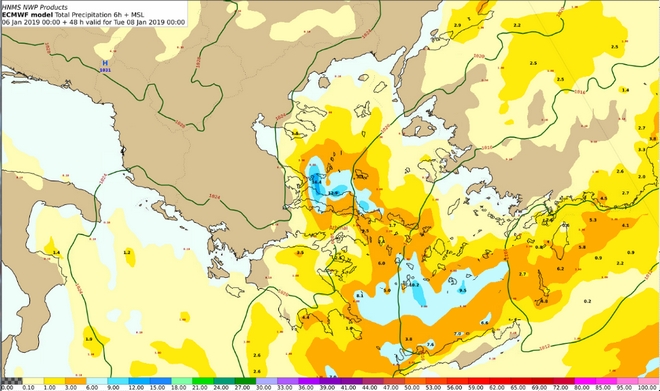 Από το μεσημέρι της Δευτέρας και καθώς έρχονται νοτιότερα οι ξηρές και ψυχρές μάζες από τα βόρεια θα προκαλέσουν φαινόμενα υετού κυρίως πάνω από τα ανατολικά προσήνεμα και θα επηρεαστεί κυρίως η Χαλκιδική, οι βόρειες Σποράδες, η ανατολική Στερεά, η Εύβοια, η ανατολική και η κεντρική Πελοπόννησος καθώς επίσης και τα νησιά του Αιγαίου, οι Κυκλάδες, η Κρήτη και τα Δωδεκάνησα.
