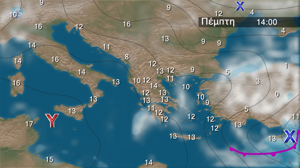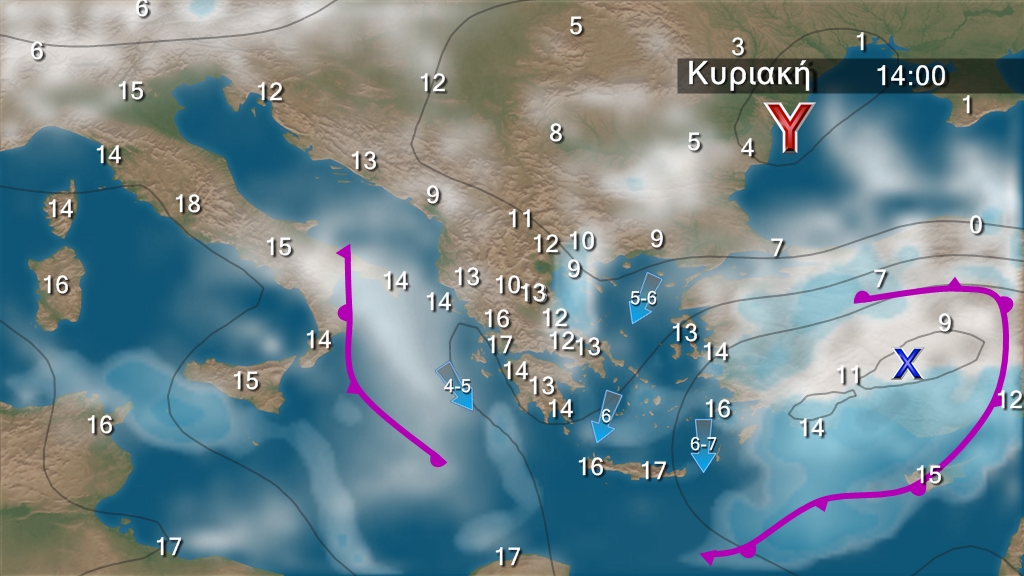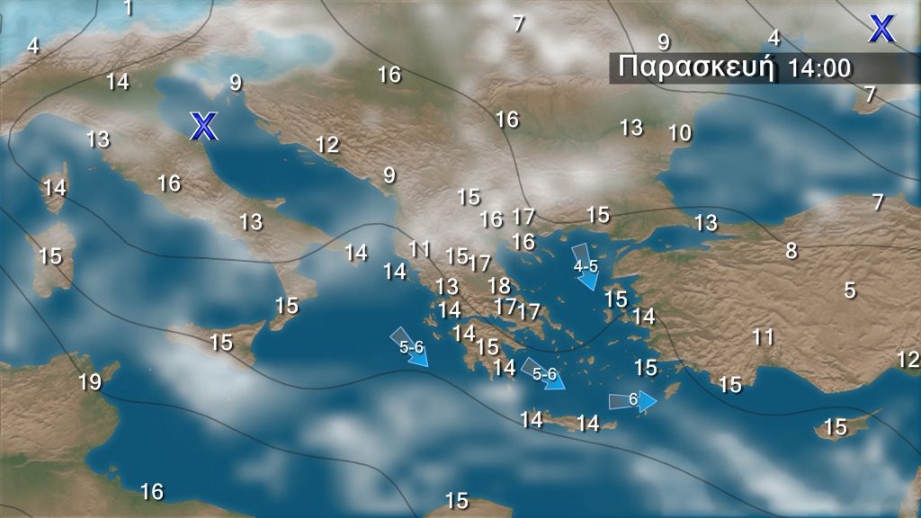 Στον χάρτη της Βαλκανικής που ακολουθεί αλλά και τον γενικό χάρτη Ελλάδος παρατηρούμε ότι στην περιοχή μας θα επικρατήσει σχεδόν αίθριος καιρός με λίγα φαινόμενα στα νότια τις πρωινές ώρες. Οι άνεμοι θα πνέουν ΒΔ 4 με 5 και τοπικά στα ανατολικά 6 με 7 μπ. Η θερμοκρασία: θα φτάσει στα βόρεια το μεσημέρι τους 13 βαθμούς στα δυτικά τους 16 στα υπόλοιπα ηπειρωτικά τους 15 βαθμούς και στα νησιά του Αιγαίου τους 13 με 15 βαθμούς Κελσίου.