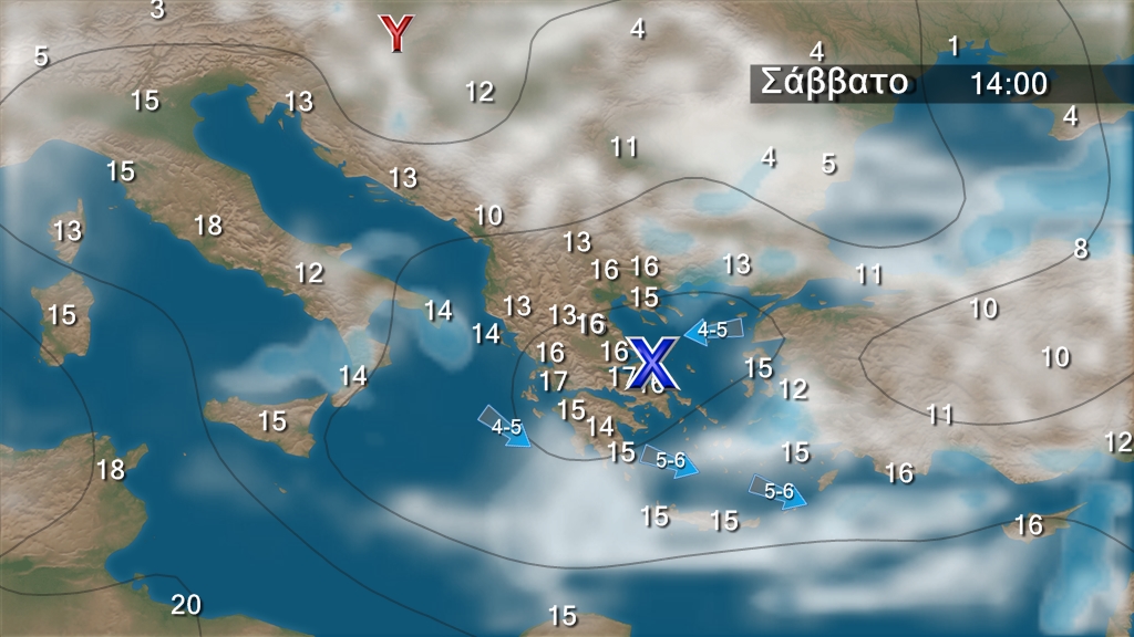 Το Σάββατο προβλέπονται νεφώσεις παροδικά αυξημένες και από το μεσημέρι θα εκδηλωθούν τοπικές βροχές. Οι άνεμοι θα πνέουν από δυτικές διευθύνσεις 3 με 5 και στα νότια τοπικά 6 μποφόρ που σταδιακά θα στραφούν σε βόρειους 5 με 6 και στο Αιγαίο τοπικά 7 μποφόρ. Η θερμοκρασία θα πέσει στα ανατολικά και βόρεια