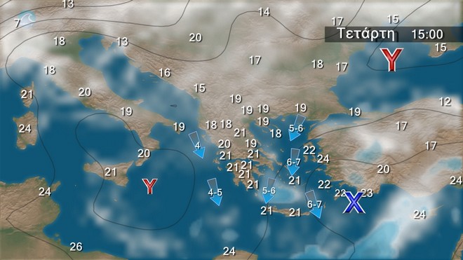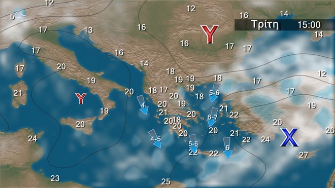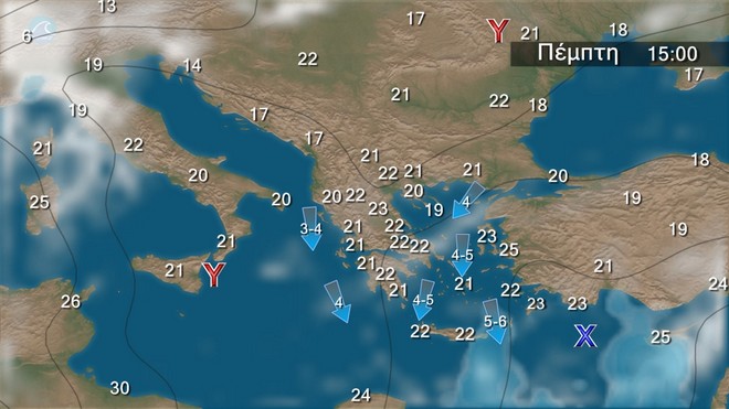 Παροδικά αυξημένες νεφώσεις στο νότιο Αιγαίο όπου θα σημειωθούν τοπικές βροχές, οι οποίες το απόγευμα θα περιοριστούν στην Κρήτη. Στην υπόλοιπη χώρα γενικά αίθριος καιρός. Οι άνεμοι θα πνέουν από βόρειες διευθύνσεις 3 με 5 μποφόρ και στο Αιγαίο τοπικά 6 μποφόρ. Η θερμοκρασία θα σημειώσει περαιτέρω μικρή άνοδο.