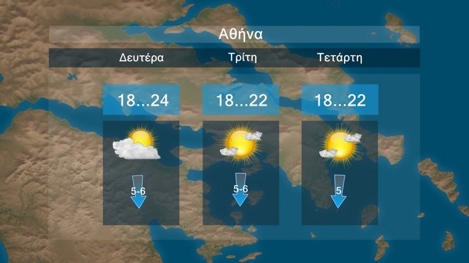 Στα δυτικά, τα κεντρικά και τα βόρεια προβλέπεται γενικά αίθριος καιρός. Στην υπόλοιπη χώρα λίγες νεφώσεις παροδικά αυξημένες με τοπικές βροχές στο Αιγαίο και πιθανόν στα Δωδεκάνησα μεμονωμένες καταιγίδες. Οι άνεμοι θα πνέουν βόρειοι βορειοανατολικοί, στα δυτικά 3 με 5, στα ανατολικά 4 με 6 και στο Αιγαίο τοπικά 7 μποφόρ με μικρή εξασθένηση το βράδυ. Η θερμοκρασία θα σημειώσει μικρή άνοδο στα ηπειρωτικά και θα κυμανθεί σε σχεδόν κανονικά για την εποχή επίπεδα.