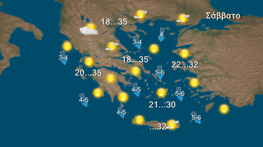 Σήμερα σε όλη τη χώρα προβλέπεται σχεδόν αίθριος καιρός με ανέμους έως 6 μποφόρ στο Αιγαίο και την θερμοκρασία να φτάνει τους 35 βαθμούς Κελσίου στο Ιόνιο και τα ηπειρωτικά και τους 30 με 32 βαθμούς στο Αιγαίο.