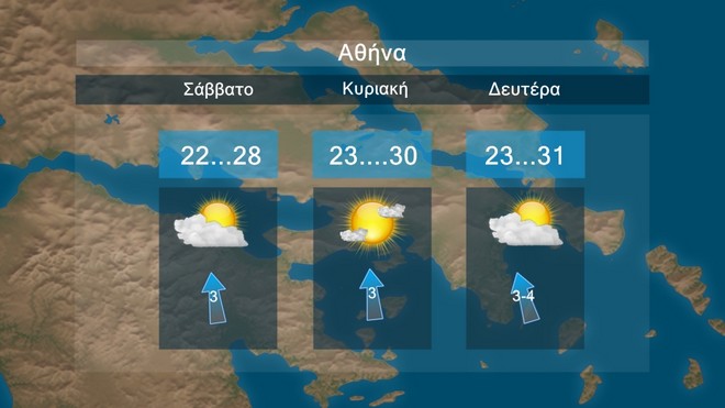 Στην Αθήνα προβλέπονται παροδικές νεφώσεις. Η θερμοκρασία θα κυμαίνεται περί τους 28 με 31 βαθμούς Κελσίου.