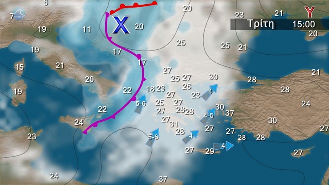 Στα δυτικά, τα κεντρικά και τα βόρεια νεφώσεις παροδικά αυξημένες με τοπικές βροχές, ενώ στα βορειοδυτικά θα εκδηλωθούν σποραδικές καταιγίδες. Στις υπόλοιπες περιοχές αραιές νεφώσεις κατά περιόδους πυκνότερες. Ευνοείται η μεταφορά σκόνης στις περισσότερες περιοχές. Οι άνεμοι θα πνέουν, στα δυτικά από νότιες διευθύνσεις 4 με 6 και στο Ιόνιο τοπικά 7 μποφόρ. Στα ανατολικά, από δυτικές διευθύνσεις 4 με 6 μποφόρ. Η θερμοκρασία δεν θα σημειώσει αξιόλογη μεταβολή και θα διατηρηθεί σε υψηλά επίπεδα στα κεντρικά και νότια.