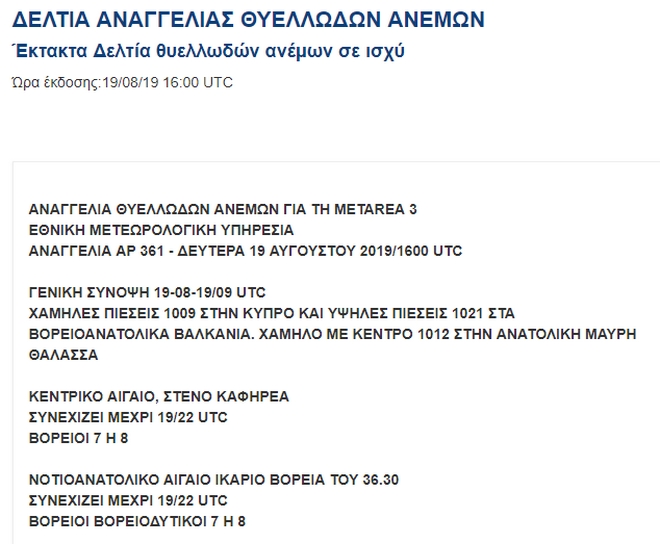 Έκτακτο δελτίο θυελλωδών ανέμων εξέδωσε τη Δευτέρα η Εθνική Μετεωρολογική Υπηρεσία. ‘Όπως αναφέρει η ΕΜΥ, κατά τη διάρκεια της μέρας, οι άνεμοι θα είναι πολύ ισχυροί και τοπικά θυελλώδεις σε μεγάλα τμήματα του Αιγαίου.