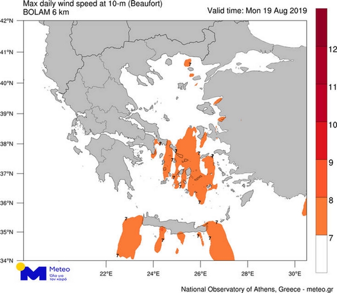 Οι άνεμοι θα πνέουν από βόρειες διευθύνσεις στα δυτικά 3 με 4, στα ανατολικά 5 με 6 και στο Αιγαίο κατά τη διάρκεια της ημέρας τοπικά 7 μποφόρ.