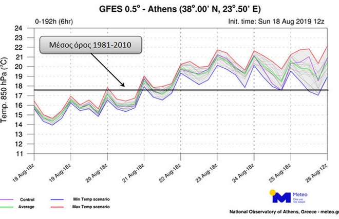Η τάση της θερμοκρασίας σε ύψος 1500 μέτρων πάνω από την Αττική για τις επόμενες 7 ημέρες, καθώς και ο μέσος όρος για τα έτη 1981-2010, παρουσιάζονται στο γράφημα που ακολουθεί.