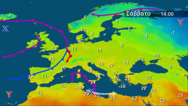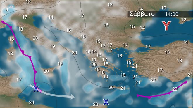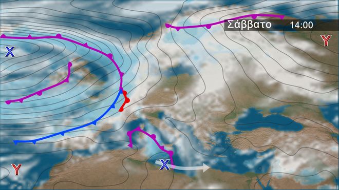 Στον χάρτη των  βαρομετρικών συστημάτων παρατηρούμε ότι υπάρχει ένα αβαθές χαμηλό στη Κεντρική Μεσόγειο το οποίο θα περάσει από τις ακτές της Αφρικής κινούμενο ανατολικά και το οποίο δεν θα μας επηρεάσει.
