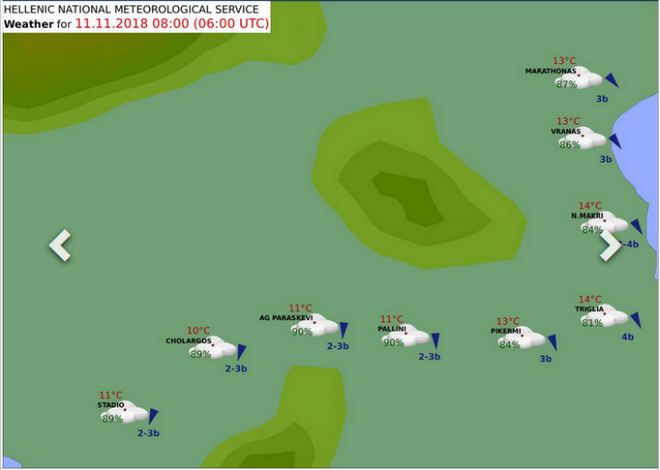 Για την διαδρομή του Μεγάλου Μαραθωνίου της Αθήνας η ΕΜΥ δεν προβλέπει βροχές, παρά μόνο νεφώσεις παροδικά αυξημένες κυρίως στα Βόρεια και Ανατολικά,  βοριάδες 3 με 4 μποφόρ και θερμοκρασία έως τους 19 βαθμούς Κελσίου. Νωρίς το πρωί θα έχει σχετική ψύχρα με θερμοκρασίες περί τους 10 με 13 βαθμούς Κελσίου.