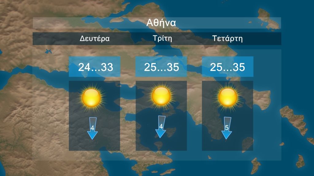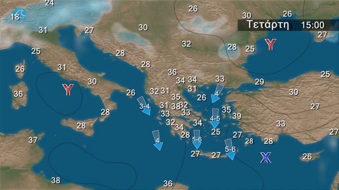 Γενικά αίθριος καιρός με πρόσκαιρες τοπικές νεφώσεις τις μεσημβρινές και απογευματινές ώρες στα ηπειρωτικά. Οι άνεμοι θα πνέουν από βόρειες διευθύνσεις 3 με 5 και στο Αιγαίο τοπικά 6 μποφόρ. Η θερμοκρασία θα σημειώσει νέα άνοδο και θα φτάσει κατά τόπους τους 37 με 38 βαθμούς Κελσίου.