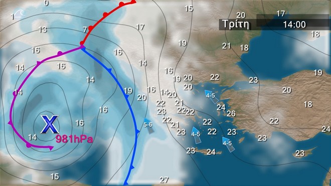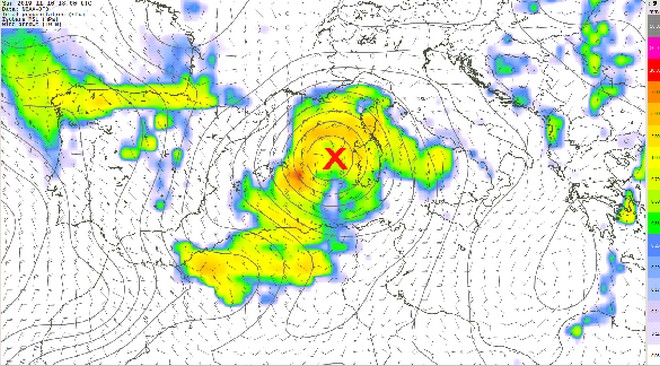 Το πολύ ισχυρό βαρομετρικό χαμηλό που ήδη έχει δημιουργηθεί από το βράδυ της Κυριακής στη Δυτική Μεσόγειο θα κινηθεί ανατολικά και θα ενοποιηθεί με το άλλο χαμηλό που έρχεται από την Λιβύη με βόρεια κίνηση και το κέντρο του χαμηλού προβλέπεται από τα 1002 hPa (mb) να πέσει την Τρίτη στα 981 hPa(mb).