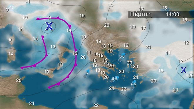 Στα νησιά του ανατολικού Αιγαίου και τα Δωδεκάνησα γενικά αίθριος καιρός. Στην υπόλοιπη χώρα, λίγες νεφώσεις τοπικά αυξημένες, με βροχές στο Ιόνιο, τα ηπειρωτικά (εκτός της ανατολικής Μακεδονίας και της Θράκης) και τις βραδινές ώρες στις δυτικές Κυκλάδες και τη δυτική Κρήτη. Καταιγίδες θα εκδηλωθούν αρχικά στο Ιόνιο, όπου πιθανώς να είναι κατά τόπους ισχυρές και από τις μεσημβρινές ώρες στα ηπειρωτικά. Τοπικά περιορισμένη ορατότητα ή ομίχλη τις πρωινές ώρες, κυρίως στα ηπειρωτικά. Οι άνεμοι θα πνέουν νοτιοανατολικοί, στα ανατολικά 4 με 6, στα δυτικά 5 με 7 και στο Ιόνιο τοπικά 8 μποφόρ. Η θερμοκρασία θα σημειώσει μικρή άνοδο.