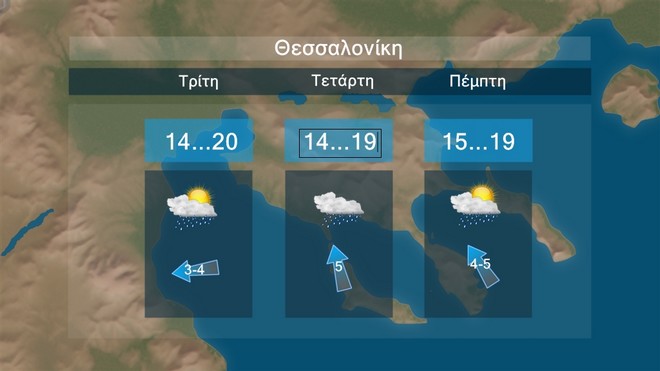 Στην ανατολική Μακεδονία, τη Θράκη, τα νησιά του ανατολικού Αιγαίου και τα Δωδεκάνησα νεφώσεις με βροχές και καταιγίδες, πιθανώς κατά τόπους ισχυρές, με βαθμιαία εξασθένηση. Στην υπόλοιπη χώρα άστατος κατά περιόδους νεφελώδης με τοπικές βροχές και στα δυτικά σποραδικές καταιγίδες, που τις βραδινές ώρες θα περιοριστούν στο Ιόνιο. Οι άνεμοι θα πνέουν νότιοι νοτιοδυτικοί 4 με 5 και στα πελάγη πρόσκαιρα τοπικά 6 μποφόρ. Η θερμοκρασία δεν θα σημειώσει αξιόλογη μεταβολή.