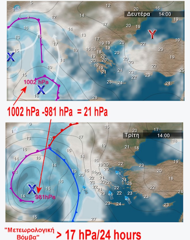 H πτώση της ατμοσφαιρικής πίεσης στο κέντρο του συστήματος θα φτάσει τα 21 hPa δηλαδή το χαμηλό αυτό θα έχει χαρακτηριστικά μιας «Μετεωρολογικής Βόμβας» η Medicane (Mediterranean Cyclone ) Μεσογειακού Κυκλώνα με πτώση πίεσης πάνω από 17 hPa σε ένα 24ωρο. Το αρχικό σύστημα αυτό ήδη τη Δευτέρα θα επηρεάσει τις Βαλεαρίδες Σαρδηνία Κορσική σε πρώτη φάση και αργότερα Ιταλία και Δυτική Ελλάδα Τρίτη προς Τετάρτη.