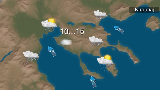 Την Κυριακή στα ανατολικά προβλέπονται τοπικές βροχές κυρίως στην κεντρική Μακεδονία, την ανατολική Θεσσαλία και τις Σποράδες. Στα δυτικά από το απόγευμα τοπικές βροχές στο Ιόνιο, οι οποίες από το βράδυ θα ενταθούν και θα εκδηλωθούν καταιγίδες που τη νύχτα πιθανώς να είναι ισχυρές. Τοπικά περιορισμένη ορατότητα ή ομίχλες τις πρωινές και βραδινές ώρες στα ηπειρωτικά. Οι άνεμοι θα πνέουν ανατολικοί νοτιοανατολικοί 3 με 5 και στα δυτικά 4 με 6 μποφόρ. Από το απόγευμα θα ενισχυθούν, στο Ιόνιο 7 με 8 και στα ανατολικά έως 6 μποφόρ. Η θερμοκρασία θα σημειώσει μικρή άνοδο στα δυτικά και τα νότια και θα έχει μέγιστη τιμή στα βόρεια τους 16 βαθμούς, στα υπόλοιπα ηπειρωτικά και το Ιόνιο τους 18 με 22 βαθμούς Κελσίου, στις Κυκλάδες και την Κρήτη τους 21 βαθμούς και στο Ανατολικό Αιγαίο και τα Δωδεκάνησα τους 20 βαθμούς Κελσίου.