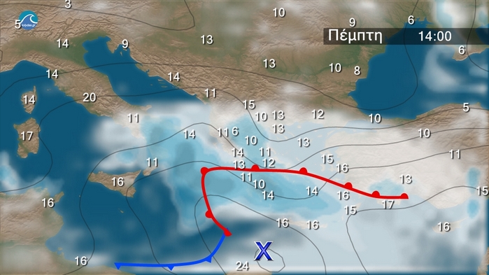 Στον χάρτη της Βαλκανικής που ακολουθεί παρατηρούμε ότι το χαμηλό θα περάσει νότια από τη χώρα μας και θα επηρεάσει κυρίως την Πελοπόννησο τις Κυκλάδες την Κρήτη και τα Δωδεκάνησα με τοπικά έντονες βροχοπτώσεις . Χιονοπτώσεις θα σημειωθούν στα ορεινά ενώ βαθμιαία από το απόγευμα τα φαινόμενα θα εξασθενήσουν και τη νύχτα θα περιοριστούν στη Νότια Νησιωτική χώρα. Οι άνεμοι θα πνέουν ανατολικοί Βορειοανατολικοί 5 με 7, στα Ανατολικά και βαθμιαία στα Νότια 8 και τοπικά 9 μποφόρ. Η θερμοκρασία θα παρουσιάσει πτώση και στα βόρεια δεν θα ξεπεράσει τους 13 βαθμούς στα δυτικά τους 16 στα ανατολικά ηπειρωτικά τους 14 και στα νησιά του Αιγαίου τους 17 με 18 βαθμούς .