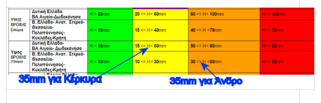 α) Αναφερόμενος στο μετεωρολογικό μέρος που άλλωστε αποτελεί αντικείμενο της δικής μου αρμοδιότητας υπενθυμίζω ότι για κάθε καιρικό φαινόμενο η ΕΜΥ έχει θέσει κάποια όρια με τα οποία χαρακτηρίζει χρωματικά τον δείκτη επικινδυνότητας. Ειδικότερα για την βροχή έχουν τεθεί κάποια όρια 12ωρου ή 24ωρου συνολικού ποσού υετού ανάλογα με την περιοχή που θα εμφανιστούν .