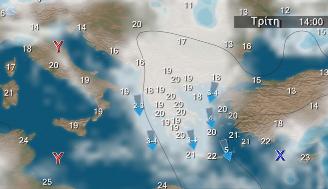 Στα ανατολικά νεφώσεις με τοπικές βροχές. Στα δυτικά λίγες νεφώσεις παροδικά αυξημένες με κατά τόπους περιορισμένη ορατότητα τις πρωινές ώρες. Οι άνεμοι θα πνέουν από βόρειες διευθύνσεις 3 με 5 και στο Αιγαίο τοπικά 6 μποφόρ. Η θερμοκρασία θα σημειώσει μικρή πτώση στα ανατολικά.