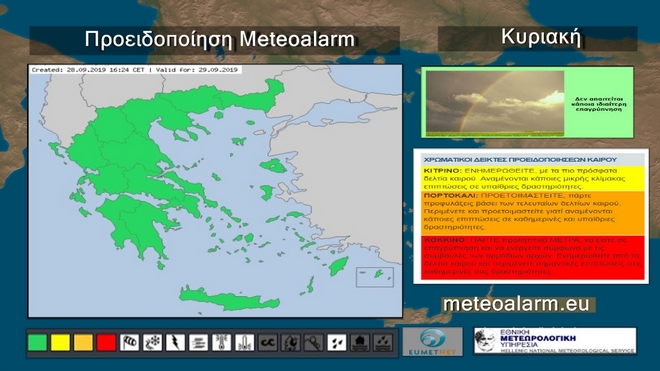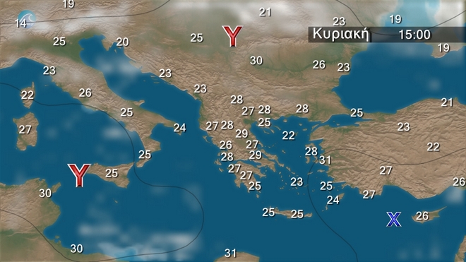Την Κυριακή προβλέπεται γενικά αίθριος καιρός. Η ορατότητα θα είναι κατά τόπους περιορισμένη στα δυτικά και τα βόρεια τις πρωινές και τις βραδινές ώρες. Οι άνεμοι θα πνέουν στα δυτικά μεταβλητοί 3 με 4 μποφόρ και βαθμιαία δυτικοί βορειοδυτικοί με την ίδια ένταση. Στα ανατολικά βόρειοι βορειοδυτικοί 3 με 4 και στο Αιγαίο 4-5 μποφόρ. Η θερμοκρασία θα σημειώσει μικρή άνοδο και θα φτάσει στα δυτικά τους 31 βαθμούς, στα βόρεια τους 31 στα υπόλοιπα ηπειρωτικά τους 32 και στο Αιγαίο τους 30 βαθμούς Κελσίου.