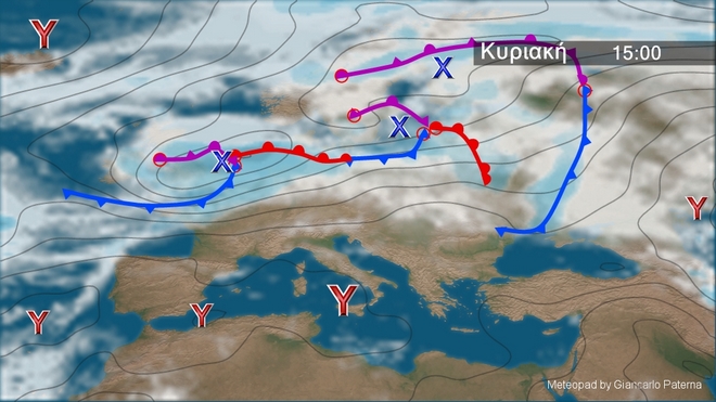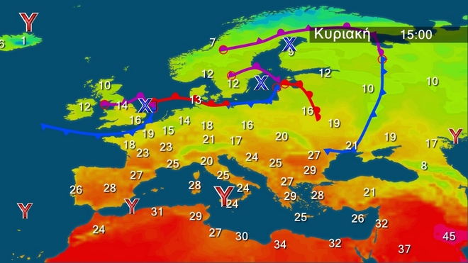 Στον γενικό χάρτη της Ευρώπης διακρίνεται ένα ισχυρό βαρομετρικό πεδίο χαμηλών πιέσεων στη Βόρεια Ευρώπη με 3 κέντρα χαμηλών πιέσεων τα οποία δεν μας επηρεάζουν. Αντίθετα στα Νότια έχουμε υψηλές πιέσεις και πολύ ζεστό καιρό.