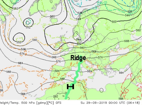 Θυμίζουμε απλά ότι αυτή την εποχή μετεωρολογικά αυτά τα μικρά καλοκαιράκια δημιουργούνται όταν έχουμε ευσταθείς καιρικές συνθήκες στην ανώτερη ατμόσφαιρα αλλά και στην επιφάνεια, με έναν ισχυρό αντικυκλώνα να καλύπτει πολλές περιοχές. Στον παραπάνω χάρτη παρατηρείται μια έξαρση (Ridge) των ισοϋψών (πράσινη γραμμή) η οποία υποδηλώνει τις περιοχές των υψηλών πιέσεων είτε αυτές είναι μετακινούμενες ή στάσιμες. Κάτω από αυτές τις περιοχές που εμφανίζεται στην επιφάνεια επικρατεί κατά κανόνα ζεστός και άνομβρος καιρός.