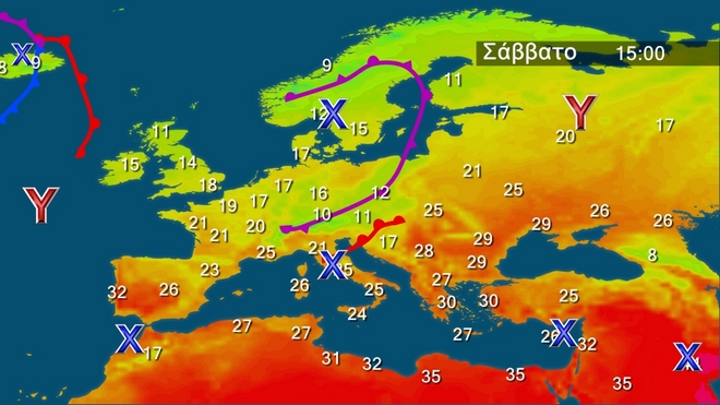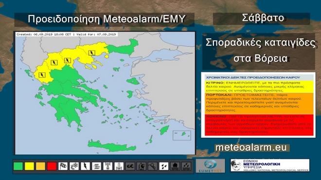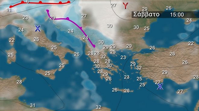 Το Σάββατο στη Μακεδονία προβλέπονται αρχικά νεφώσεις με τοπικές βροχές και κυρίως τις μεσημβρινές ώρες σποραδικές καταιγίδες. Στην υπόλοιπη χώρα γενικά αίθριος καιρός, ενώ τις μεσημβρινές και απογευματινές ώρες όμως στα ηπειρωτικά θα αναπτυχθούν πρόσκαιρες νεφώσεις και θα εκδηλωθούν τοπικοί όμβροι ή μεμονωμένες καταιγίδες κυρίως στα βορειοδυτικά ορεινά. Οι άνεμοι θα πνέουν στα δυτικά από δυτικές διευθύνσεις 3 με 4 μποφόρ, στα ανατολικά από βόρειες 3 με 5 και τοπικά στο Αιγαίο μέχρι 6 μποφόρ. Η θερμοκρασία θα σημειώσει μικρή πτώση στα βόρεια και θα φτάσει στα δυτικά τους 32 βαθμούς στα υπόλοιπα ηπειρωτικά τους 31 με 32 , στις Κυκλάδες τους 28 στη νότια Κρήτη τους 31 και στο Ανατολικό Αιγαίο τους 29 βαθμούς Κελσίου.
