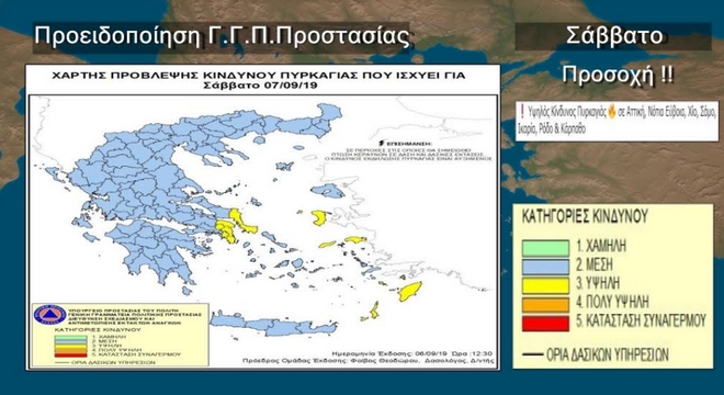Από πλευράς επικινδυνότητας πυρκαγιών θα έχουμε Υψηλό Κίνδυνο Πυρκαγιάς σε Αττική, Νότια Εύβοια, Χίο, Σάμο, Ικαρία, Ρόδο και Κάρπαθο σύμφωνα με την πρόβλεψη της Γενικής Γραμματείας Πολιτικής Προστασίας.