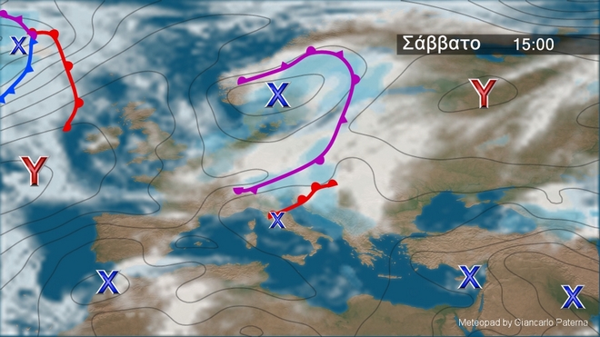Στον γενικό χάρτη της Ευρώπης διακρίνονται τα χαμηλά που επηρεάζουν την Βόρεια κυρίως Ευρώπη ενώ το σύστημα που βρίσκεται στην περιοχή της Ιταλίας παραμένει σχεδόν στάσιμο.
