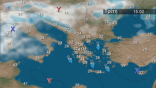 Γενικά αίθριος καιρός. Στα ηπειρωτικά τις μεσημβρινές και απογευματινές ώρες θα αναπτυχθούν πρόσκαιρες νεφώσεις και θα εκδηλωθούν τοπικοί όμβροι στα βορειοανατολικά ορεινά. Οι άνεμοι θα είναι δυτικοί βορειοδυτικοί 3 με 5 και στα νοτιοανατολικά τοπικά 6 μποφόρ. Η θερμοκρασία θα κυμανθεί σε υψηλά επίπεδα, θα φτάσει τοπικά στα ηπειρωτικά τους 41 βαθμούς.