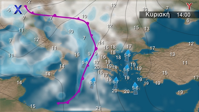Στο Ιόνιο, την Κρήτη, τα Δωδεκάνησα, βαθμιαία στα ηπειρωτικά πλην της ανατολικής Μακεδονίας και της Θράκης και τις Κυκλάδες προβλέπονται νεφώσεις με τοπικές βροχές, λίγα χιόνια στα ορεινά και κυρίως στα θαλάσσια-παραθαλάσσια σποραδικές καταιγίδες. Τα φαινόμενα σταδιακά από το μεσημέρι στο Ιόνιο θα ενταθούν. Στις υπόλοιπες περιοχές λίγες νεφώσεις που βαθμιαία θα αυξηθούν. Οι άνεμοι θα πνέουν, στα δυτικά νότιοι νοτιοανατολικοί 5 με 6 στο Ιόνιο 7 και πρόσκαιρα έως 8 μποφόρ. Στα ανατολικά από ανατολικές διευθύνσεις 3 με 5 και βαθμιαία στο Αιγαίο τοπικά 6 μποφόρ. Η θερμοκρασία θα σημειώσει άνοδο.