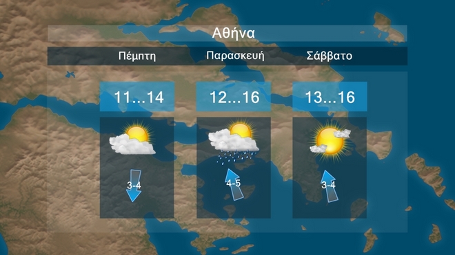 Στην Αθήνα προβλέπονται παροδικές νεφώσεις με βροχές την Παρασκευή . Η θερμοκρασία θα κυμαίνεται μεταξύ 14 και 16 βαθμών Κελσίου