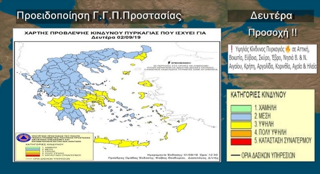 Από πλευράς επικινδυνότητας πυρκαγιών την Δευτέρα θα έχουμε Υψηλό Κίνδυνο Πυρκαγιάς σε Αττική, Βοιωτία, Εύβοια, Σκύρο, Έβρο, Νησιά Β. & Ν. Αιγαίου, Κρήτη, Αργολίδα, Κορινθία, Αχαΐα & Ηλεία σύμφωνα με την πρόβλεψη της Γενικής Γραμματείας Πολιτικής Προστασίας.