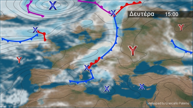 Στον γενικό χάρτη της Ευρώπης διακρίνεται ο αντικυκλώνας στην Ανατολική Ευρώπη που πλέον έχει εξασθενήσει καθώς πλησιάζει το σύστημα από την Κεντρική Ευρώπη. Αυτό θα έχει σαν αποτέλεσμα αν εξασθενήσει και το μελτέμι στο Αιγαίο.