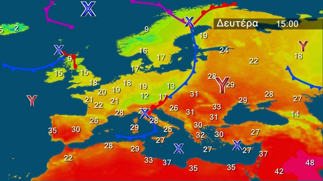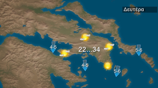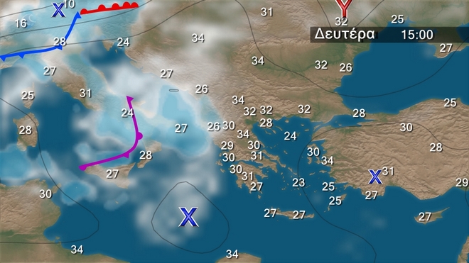 Τη Δευτέρα στα δυτικά προβλέπονται λίγες νεφώσεις παροδικά αυξημένες με τοπικές βροχές και στα βόρεια κυρίως ορεινά τις μεσημβρινές και απογευματινές ώρες σποραδικές καταιγίδες. Στην υπόλοιπη χώρα γενικά αίθριος καιρός με πιθανότητα τοπικών όμβρων στα κεντρικά και βόρεια ορεινά τις μεσημβρινές και απογευματινές ώρες. Οι άνεμοι από βόρειες διευθύνσεις στο Αιγαίο μέχρι 6 μποφόρ. Η θερμοκρασία δεν θα σημειώσει αξιόλογη μεταβολή και θα φτάσει στα βόρεια και δυτικά ηπειρωτικά τους 35 βαθμούς στα ανατολικά τοπικά 36 βαθμούς, στις Κυκλάδες τους 30 στη νότια Κρήτη τους 32 και στο Ανατολικό Αιγαίο τους 34 βαθμούς Κελσίου.