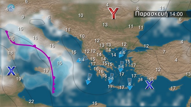 Στα δυτικά και τα βόρεια προβλέπεται γενικά αίθριος καιρός. Στις υπόλοιπες περιοχές θα υπάρχουν λίγες νεφώσεις παροδικά αυξημένες με τοπικές βροχές στα ανατολικά ηπειρωτικά, την Κρήτη και τα Δωδεκάνησα όπου είναι πιθανόν να σημειωθούν και μεμονωμένες καταιγίδες. Οι άνεμοι θα πνέουν στα δυτικά από ανατολικές διευθύνσεις 4 με 6 μποφόρ και στα ανατολικά βορειοανατολικοί 6 με 7 και τοπικά στο Αιγαίο 8 μποφόρ. Η θερμοκρασία θα σημειώσει περαιτέρω πτώση.
