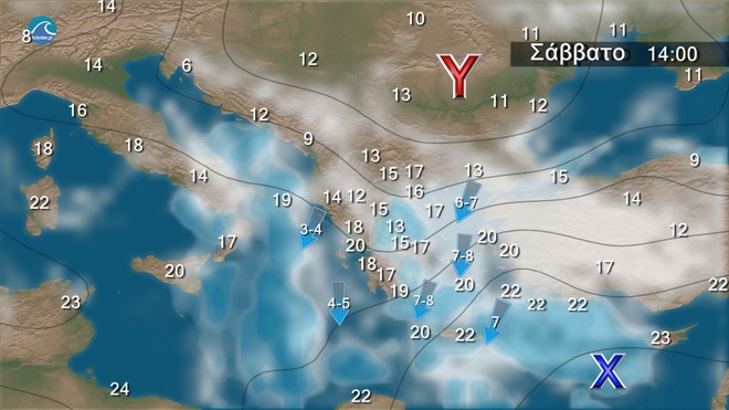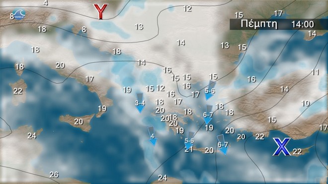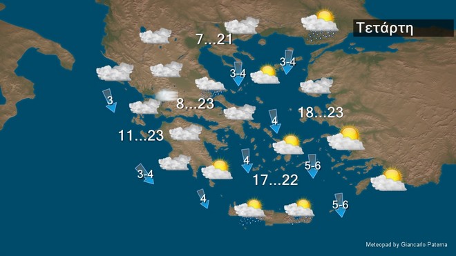 Στη δυτική και την κεντρική Μακεδονία και τα ανατολικά κυρίως ηπειρωτικά, τις Σποράδες, την Εύβοια, τις Κυκλάδες και την Κρήτη, νεφώσεις με τοπικές βροχές και στο νότιο Ιόνιο πιθανώς μεμονωμένες καταιγίδες. Στις υπόλοιπες περιοχές λίγες τοπικές νεφώσεις. Οι άνεμοι θα πνέουν, στα δυτικά από ανατολικές διευθύνσεις 3 με 5 μποφόρ, στα ανατολικά βορειοανατολικοί 4 με 6 και στο Αιγαίο 7 μποφόρ. Η θερμοκρασία θα σημειώσει μικρή πτώση στα ανατολικά.