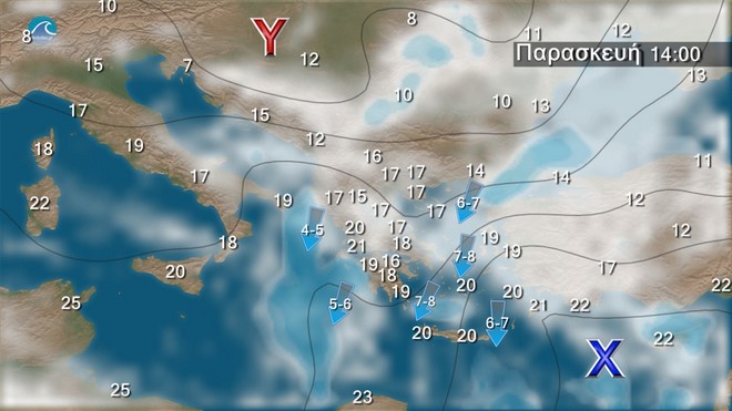 Στα δυτικά και τα βόρεια γενικά αίθριος καιρός. Στα ανατολικά και τα νότια, νεφώσεις παροδικά αυξημένες με ασθενείς τοπικές βροχές στις Κυκλάδες και την βόρεια Κρήτη. Οι άνεμοι θα πνέουν βορειοανατολικοί 4 με 6 και στο Αιγαίο 7 τοπικά 8 μποφόρ με σταδιακή εξασθένηση από το Σάββατο. Η θερμοκρασία θα σημειώσει περαιτέρω πτώση το Σάββατο.