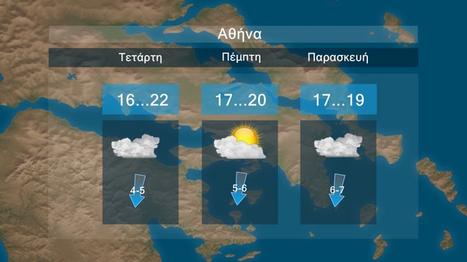 Στην Αθήνα προβλέπονται τοπικές νεφώσεις παροδικά αυξημένες. Η θερμοκρασία θα έχει μέγιστες τιμές περί τους 19 με 22 βαθμούς Κελσίου.