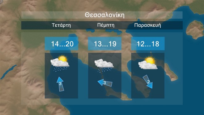Στη Θεσσαλονίκη προβλέπονται αυξημένες νεφώσεις με βροχή την Τετάρτη και Πέμπτη. Η θερμοκρασία θα κυμαίνεται μεταξύ 18 και 20 βαθμών Κελσίου.