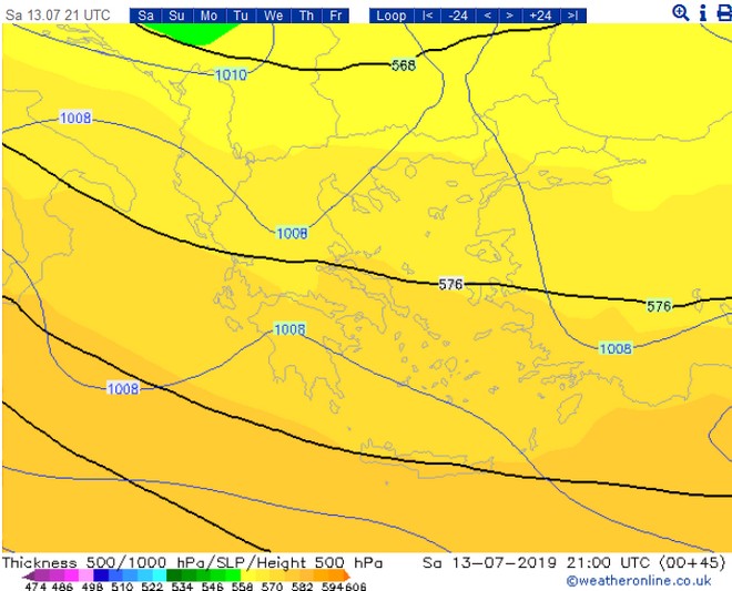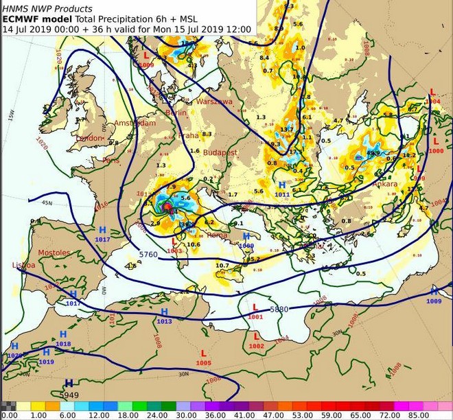 Το συνολικό κύμα που θα μας επηρεάσει διακρίνεται στην μεγαλύτερη φωτογραφία της Νοτιοανατολικής Ευρώπης με τα ύψη στα 500 hPa, τον χάρτη της επιφάνειας και τα ύψη του υετού.