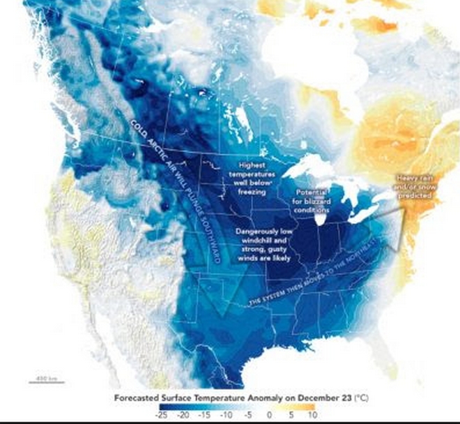 Από χθες αναφέραμε ότι οι επιφανειακές θερμοκρασίες στην Αμερική τις επόμενες ημέρες θα πέσουν τουλάχιστον 25 βαθμούς κάτω από το μέσο όρο καθώς το κύμα παγωμένου αέρα από τον Καναδά θα κινηθεί προς στο Τέξας και θα “πυροδοτήσει” ένα εντυπωσιακό χειμερινό σύστημα , που θα δημιουργήσει συνθήκες χιονοθύελλας για μεγάλα τμήματα της Midwest, της κοιλάδας του Οχάιο και των Μεγάλων Λιμνών.