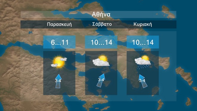 Στην Αθήνα προβλέπονται τοπικές νεφώσεις το επόμενο τριήμερο με λίγες βροχές. Η θερμοκρασία θα έχει μέγιστες τιμές περί τους 11 με 14 βαθμούς Κελσίου.
