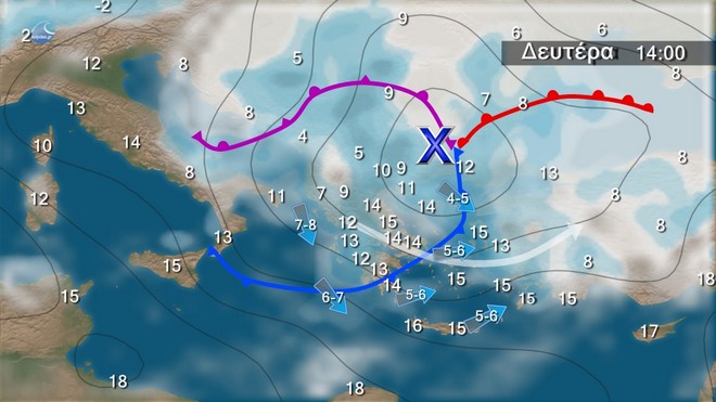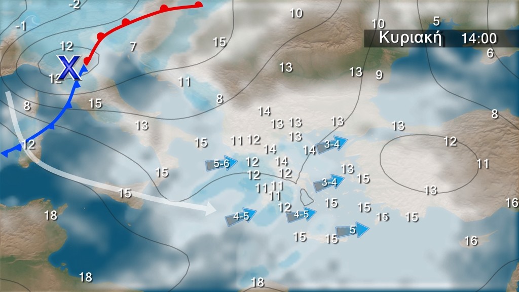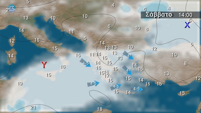 Νεφώσεις με τοπικές βροχές. Σποραδικές καταιγίδες θα εκδηλωθούν αρχικά στα δυτικά και από το μεσημέρι βαθμιαία και στις υπόλοιπες περιοχές, κυρίως τις βόρειες και στα νησιά του ανατολικού Αιγαίου. Χιονοπτώσεις θα σημειωθούν στα ηπειρωτικά ορεινά. Τα φαινόμενα από το βράδυ στα δυτικά θα εξασθενήσουν. Οι άνεμοι θα πνέουν από νότιες διευθύνσεις 4 με 6 μποφόρ, στρεφόμενοι βαθμιαία από τα δυτικά σε δυτικούς βορειοδυτικούς 6 με 7 και στο Ιόνιο από το απόγευμα τοπικά έως 8 μποφόρ. Η θερμοκρασία θα σημειώσει πτώση.