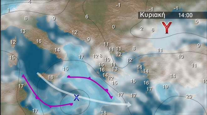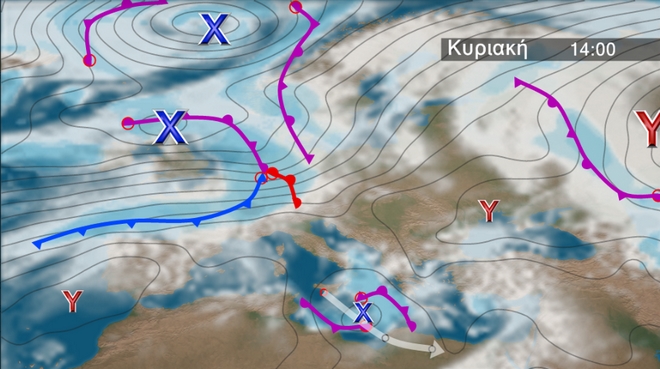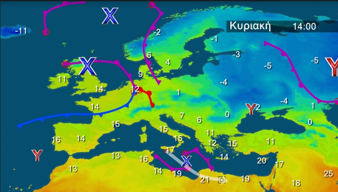 Στον χάρτη των βαρομετρικών συστημάτων της Ευρώπης παρατηρούμε ότι υπάρχει βαρομετρικό χαμηλό στη Κεντρική Μεσόγειο το οποίο θα κινηθεί ανατολικά νοτιοανατολικά και θα μας επηρεάσει με φαινόμενα κυρίως στα Δυτικά και τα Νότια της χώρας μας. Οι θερμοκρασίες την Κυριακή στη χώρα μας θα είναι περίπου ίδιες με της Αγγλίας.