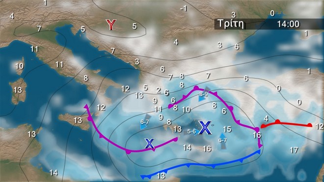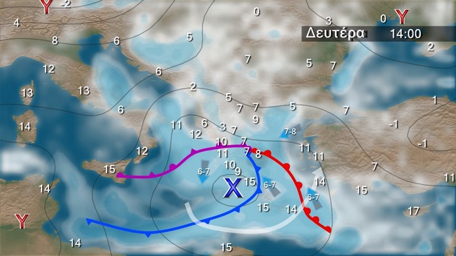 Την Τρίτη το σύστημα αυτό θα κινηθεί αργά ανατολικά και θα επηρεάσει σχεδόν όλη τη χώρα και κυρίως τα κεντρικά και νότια.