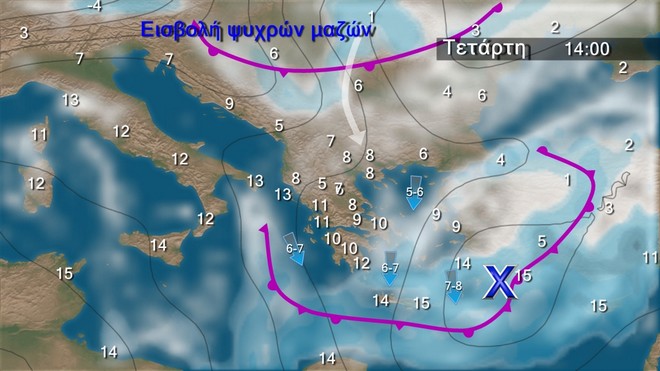 Λόγω του ΒΑ ενισχυμένου ρεύματος με εντάσεις ανέμων στα 8 με 9 μποφόρ, θα έχουμε πτώση της θερμοκρασίας και αρκετά φαινόμενα στα ανατολικά και νότια.