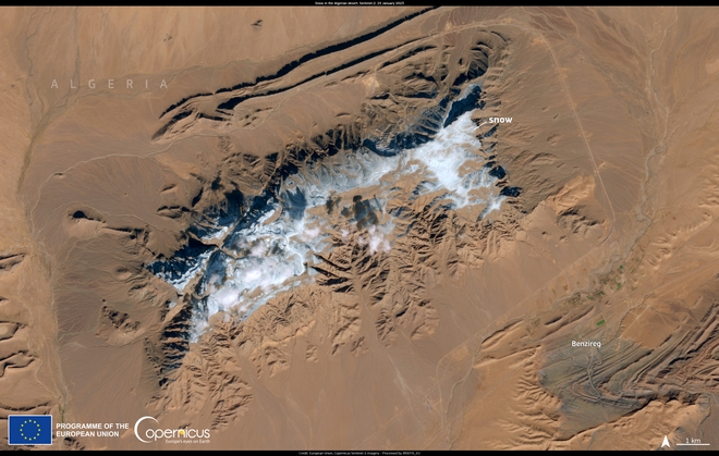 Η παραπάνω εικόνα, αποκτήθηκε στις 25 Ιανουαρίου 2023 από έναν από τους δορυφόρους Copernicus Sentinel-2, που μας δείχνει τις χιονισμένες κορυφές και την πόλη Benzireg. Οι χιονοπτώσεις είναι πολύ σπάνιες στη Σαχάρα λόγω των υψηλών θερμοκρασιών και του ξηρού αέρα.